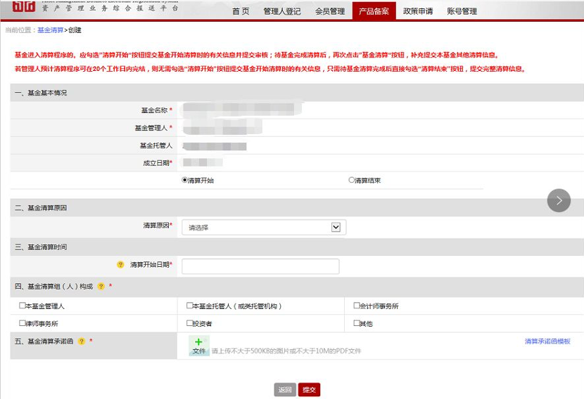 私募基金在中基协进行清算备案前,需首先完成以往季度/年度数据更新。之后可以根据实际情况,在中基协系统中勾选“清算开始”、“清算结束”,并填写私募基金基本情况、清算原因、清算时间、清算人构成、清算报告、投资者信息更新、私募基金清算情况表、基金清算承诺函、管理人(投资顾问)需要说明问题的文件。