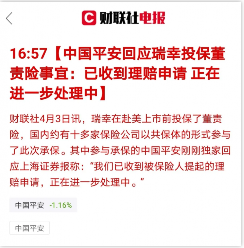 中国太保也声明以跟单的形式参与了瑞幸的董监高责任险的共保业务,还未正式收到被保险人提起的理赔申请。